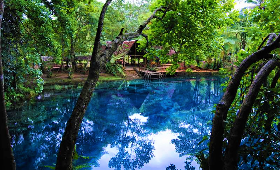 神秘的な透明度と青さを誇る湧き水によってできた湖。有名なナンダ(ジャッキーズ)ブルーホールをはじめ5つのブルーホールがある。リリブルーホールへは現地の木彫りのカヌーに乗り、流れの緩やかな川を上ってアクセスするのだがその風景はあまりに幻想的。