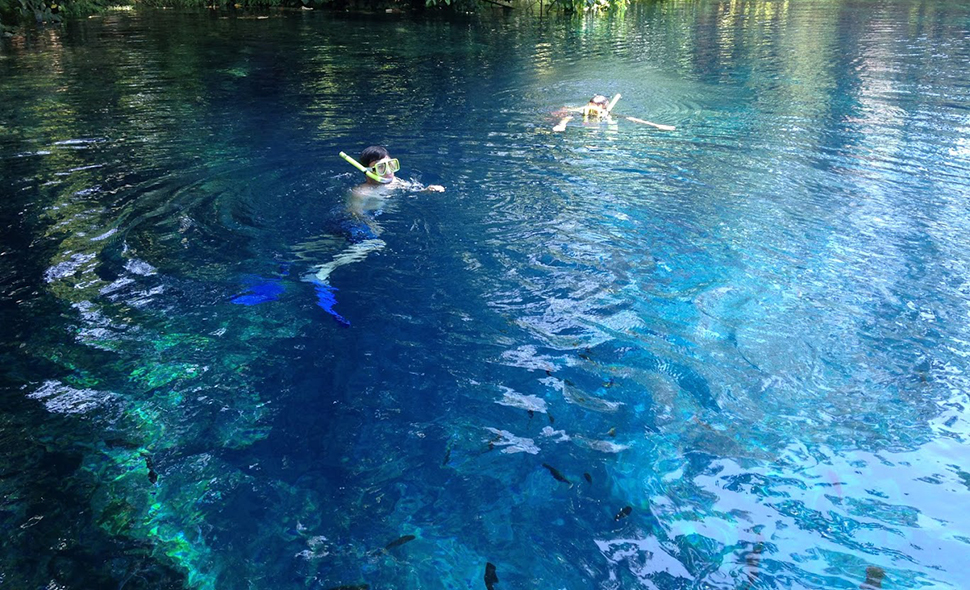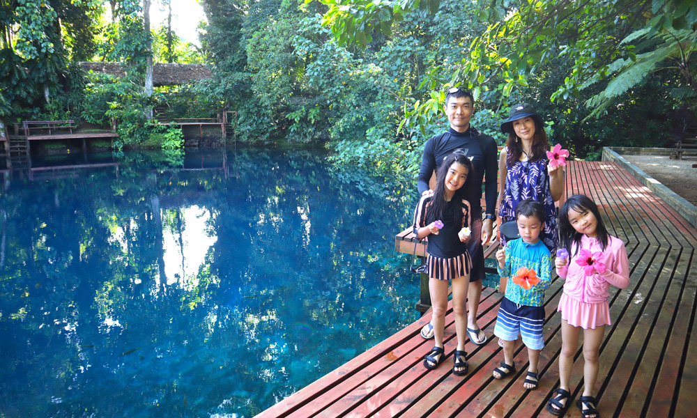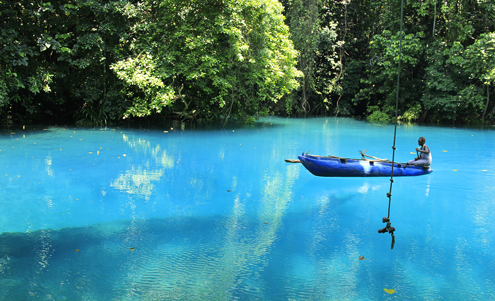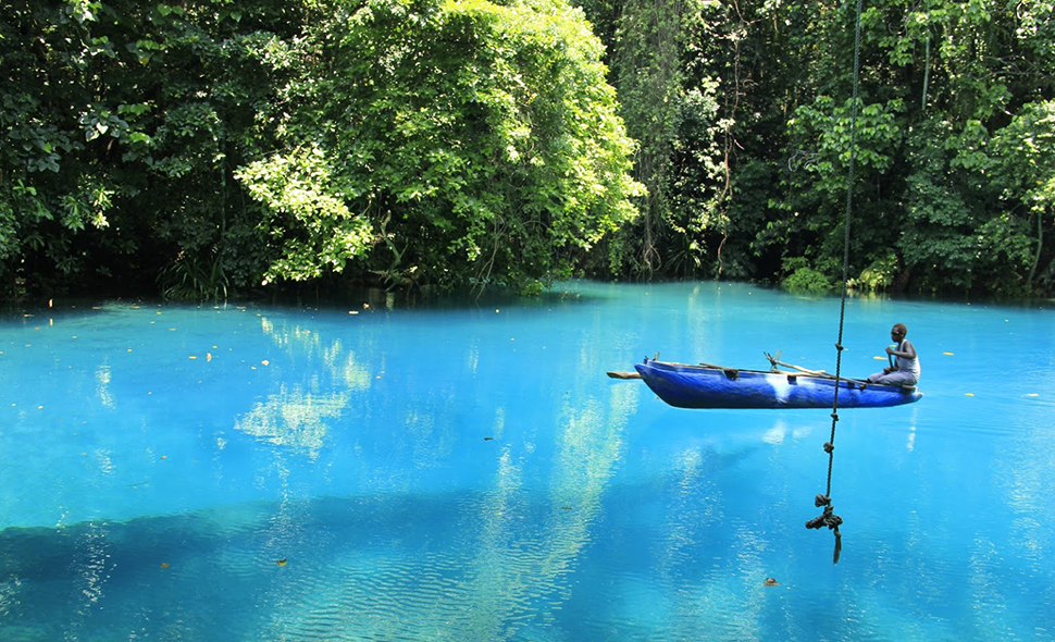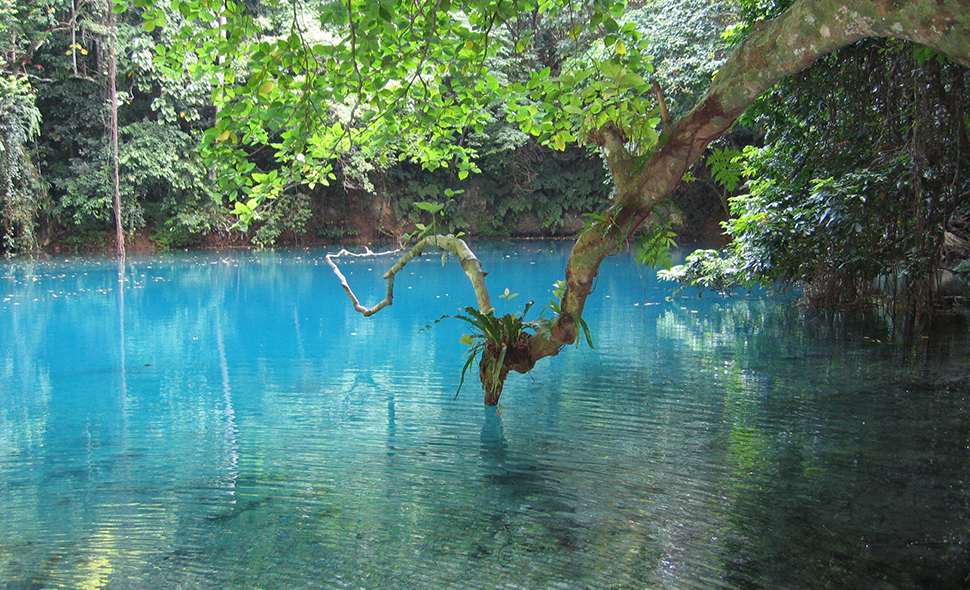 神秘的な透明度と青さを誇る湧き水によってできた湖。有名なナンダ(ジャッキーズ)ブルーホールをはじめ5つのブルーホールがある。リリブルーホールへは現地の木彫りのカヌーに乗り、流れの緩やかな川を上ってアクセスするのだがその風景はあまりに幻想的。